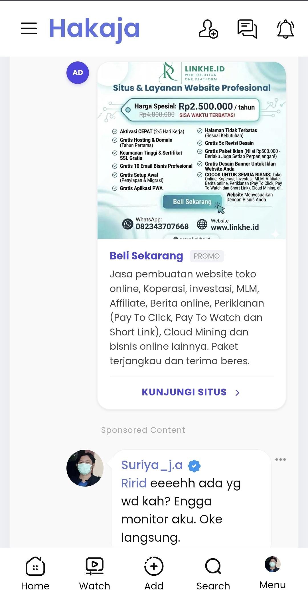 Ngomong² soal iklan, kalian mau engga kalau kita adakan system agen? Kalau ada yang mau pasang iklan di situs kita bayarnya yang ke agen, nah yg jadi agen terserah aja mau ngasih berapa ke komunitas untuk biaya poin anggota. Sisanya ambil aja buat yg berhasil nyari sponsor tersebut.Sebenarnya sistem periklanan kita ini sudah bagus. Iklan bisa muncul di newsfeed dan dikolom komentar. Format iklan juga lengkap, bisa photo, video dan boost postingan. Tapi memang belum waktunya aja. Ngomong² soal iklan, kalian mau engga kalau kita adakan system agen? Kalau ada yang mau pasang iklan di situs kita bayarnya yang ke agen, nah yg jadi agen terserah aja mau ngasih berapa ke komunitas untuk biaya poin anggota. Sisanya ambil aja buat yg berhasil nyari sponsor tersebut.0 Comments 0 Shares 211 Views 0 Reviews -