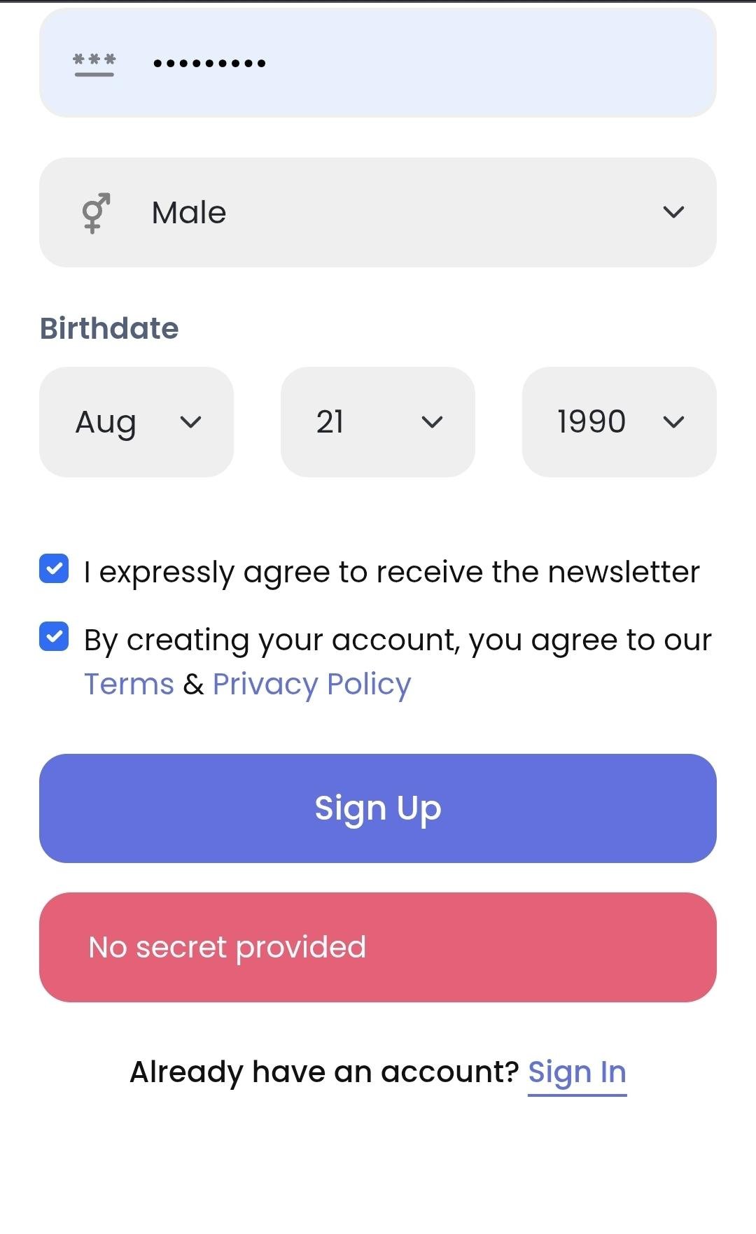 Fix: Sign Up "No Secret Provided" error