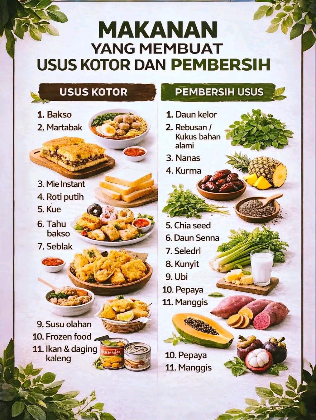 🍽️ Makanan yang Membuat Usus Kotor dan Pembersih Usus ⚠️ Makanan yang Dapat Membuat Usus “Kotor” 1. Bakso Sering mengandung pengawet dan tinggi lemak jika dikonsumsi berlebihan. 2. Martabak Tinggi minyak dan kalori sehingga dapat membebani pencernaan. 3. Mie Instan Mengandung natrium tinggi dan rendah serat. 4. Roti Putih Seratnya rendah sehingga kurang baik untuk kesehatan usus. 5. Kue Banyak gula dan lemak yang dapat mengganggu pencernaan. 6. Tahu Bakso Olahan yang biasanya digoreng dan tinggi lemak. 7. Seblak Bumbu dan minyak yang tinggi dapat memicu gangguan pencernaan. 8. Gorengan Minyak berlebih dapat memperlambat kerja sistem pencernaan. 9. Susu Olahan Mengandung gula tambahan yang bisa memengaruhi kesehatan usus. 10. Frozen Food Kaleng Umumnya mengandung pengawet dan rendah serat. 🌿 Makanan yang Membantu Membersihkan Usus 1. Daun Kelor Kaya serat dan antioksidan yang baik untuk pencernaan. 2. Rebusan / Kukus Bahan Alami Cara masak sehat yang membantu menjaga nutrisi makanan. 3. Nanas Mengandung enzim bromelain yang membantu pencernaan. 4. Chia Seed Tinggi serat yang membantu melancarkan BAB. 5. Daun Senna Dikenal membantu merangsang pergerakan usus. 6. Seledri Mengandung serat dan air yang baik untuk pencernaan. 7. Kunyit Memiliki sifat antiinflamasi dan baik untuk kesehatan usus. 8. Ubi Sumber serat alami yang membantu kesehatan pencernaan. 9. Pepaya Mengandung enzim papain yang membantu melancarkan pencernaan. 10. Manggis Kaya antioksidan yang baik untuk kesehatan tubuh dan pencernaan. #Hakaja #Makincuan🤑🤑 Semoga kita dijauhkan segala penyakit dan didatangkan rezeki 🙏🙏🙏